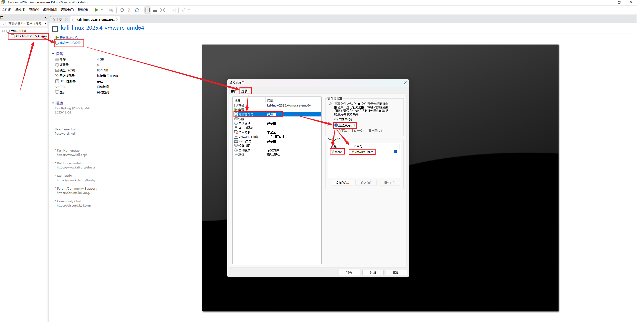 编辑虚拟机设置->选项->共享文件夹->总是启用-> 添加主机挂载文件夹 ->确认