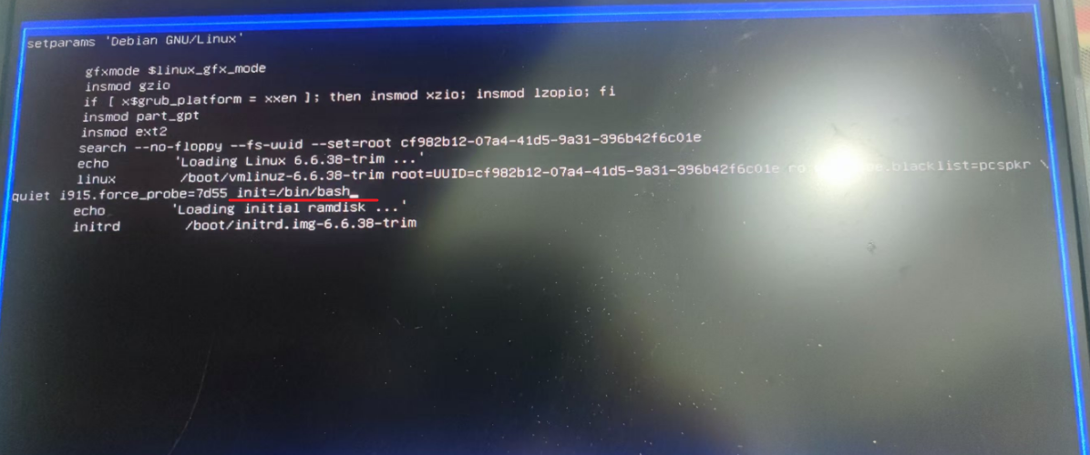 linux开头那一行后面追加init=/bin/bash,注意要空格隔开4)点击