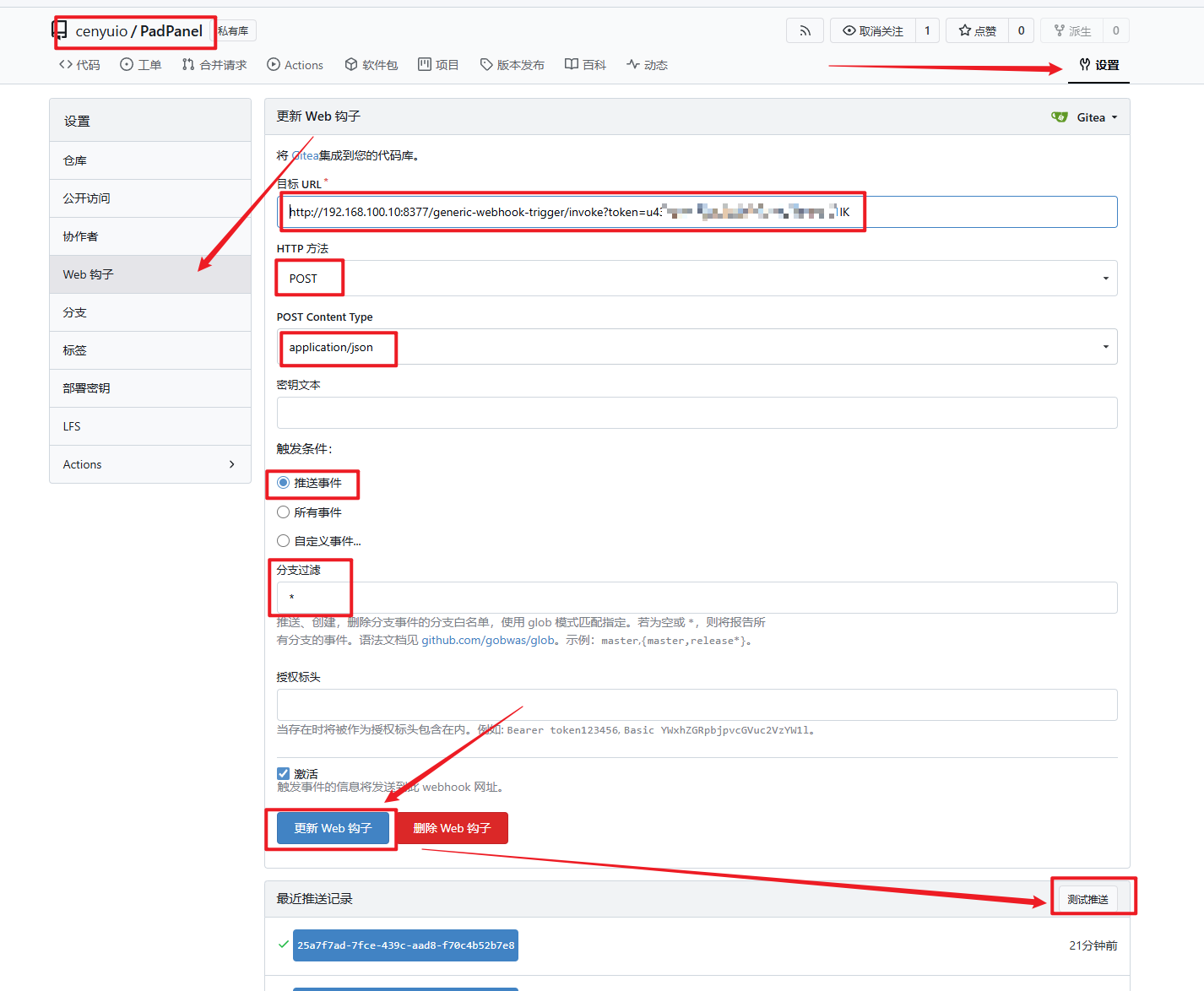 token: 'Gitea Webhook 的token'